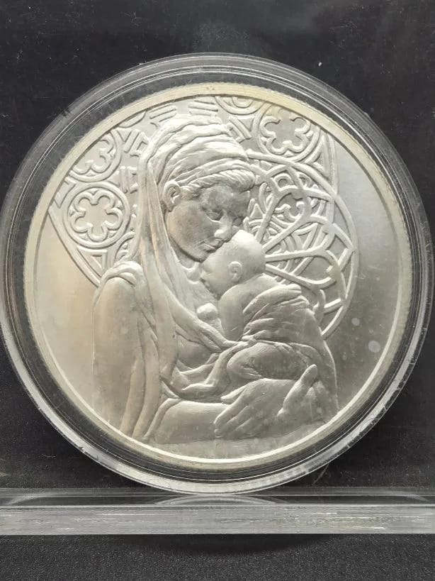 + Free ShippingThis 2015 Silver Shield round is struck from one troy ounce of .999 fine silver and features a deeply detailed, emotionally powerful mother and child design. The artwork depicts a mother tenderly holding her infant, symbolizing protection, love, and humanity, framed by an intricate ornamental background that adds depth and visual contrast.