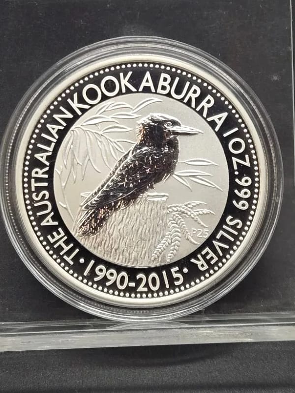 The reverse features a beautifully detailed kookaburra perched among eucalyptus branches, enhanced by a “P25” privy mark signifying the 25th anniversary. Encircling the design is the commemorative inscription “The Australian Kookaburra 1990–2015” along with the silver purity designation. The obverse bears the effigy of Queen Elizabeth II, along with the face value.