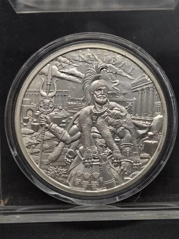 + Free ShippingThis striking silver round is struck from one troy ounce of .999 fine silver and features a dramatic high-relief depiction of Hannibal Barca, the legendary Carthaginian general. The design portrays Hannibal in detailed armor, holding a spear, with classical ruins and battlefield elements in the background—symbolizing strategy, power, and defiance against overwhelming odds.