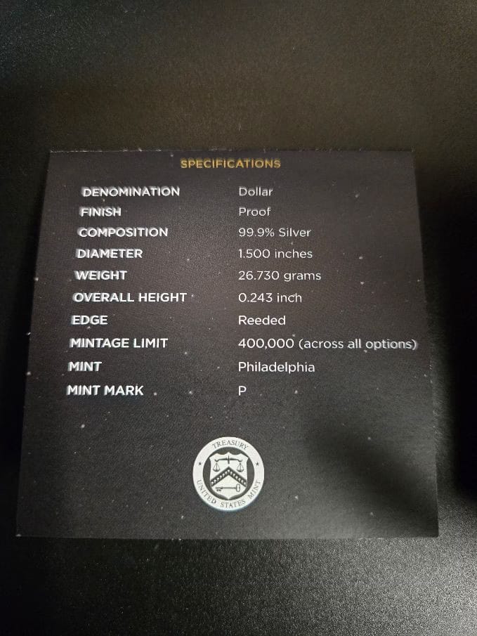 Struck in limited quantities, this historic coin features a unique curved design—a first for a U.S. commemorative coin. The obverse depicts a detailed image of a footprint on the lunar surface, symbolizing Neil Armstrong’s historic first step. The reverse showcases an iconic image of Buzz Aldrin’s helmet visor reflecting Armstrong, the U.S. flag, and the lunar lander.