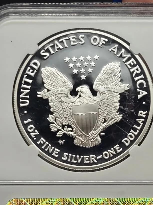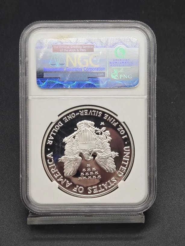 This coin has been certified PF70 by NGC (Numismatic Guaranty Company), indicating a perfect proof coin with no visible imperfections under magnification. PF70 Silver Eagles are highly desirable among collectors for their flawless quality and strong eye appeal.