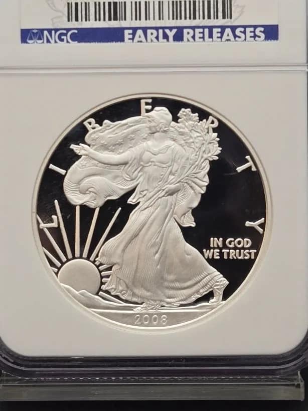 + Free Shipping2008-W Proof American Silver Eagle was struck at the West Point Mint and certified by NGC in flawless PF70 Ultra Cameo condition, the highest grade possible. The Early Releases designation confirms the coin was received by NGC within the first 30 days of release, adding desirable collector appeal.