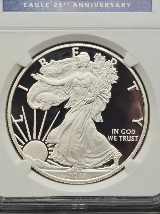 Issued as part of the highly sought-after 25th Anniversary Silver Eagle program, this proof coin features deeply mirrored fields and bold frosted devices that exemplify Ultra Cameo contrast. The obverse displays Adolph A. Weinman’s iconic Walking Liberty design, while the reverse showcases the classic heraldic eagle with shield.
