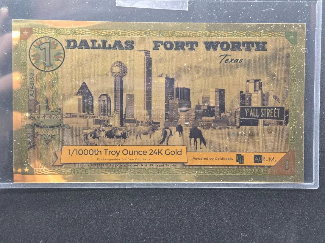 The 2025 $1 Dallas–Fort Worth Texas Goldback is perfect for those looking to add a distinctive piece of fractional gold currency to their collection.