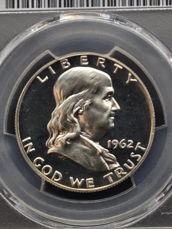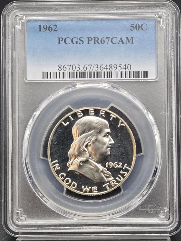 + Free ShippingThis stunning 1962 Franklin Half Dollar Proof is a beautifully preserved example of pre-1964 U.S. silver coinage. Certified PR67CAM by Professional Coin Grading Service, this coin features strong cameo contrast with deeply mirrored fields and frosted design elements.