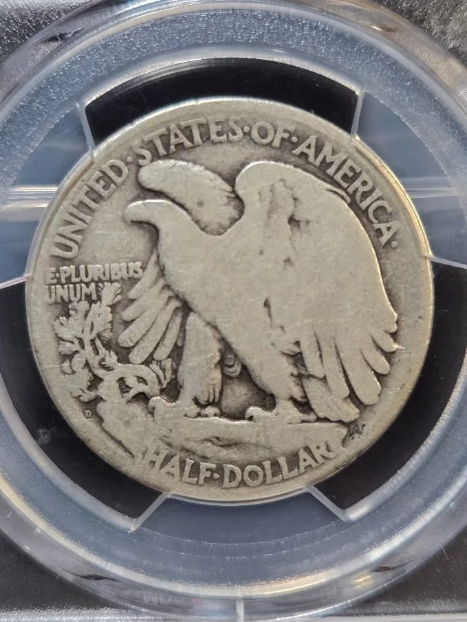 Struck at the Denver Mint, this coin features Adolph A. Weinman’s classic design of Liberty striding toward the dawn, with the American flag draped over her shoulders. The reverse shows a proud eagle perched on a rocky crag, symbolizing American strength and independence.