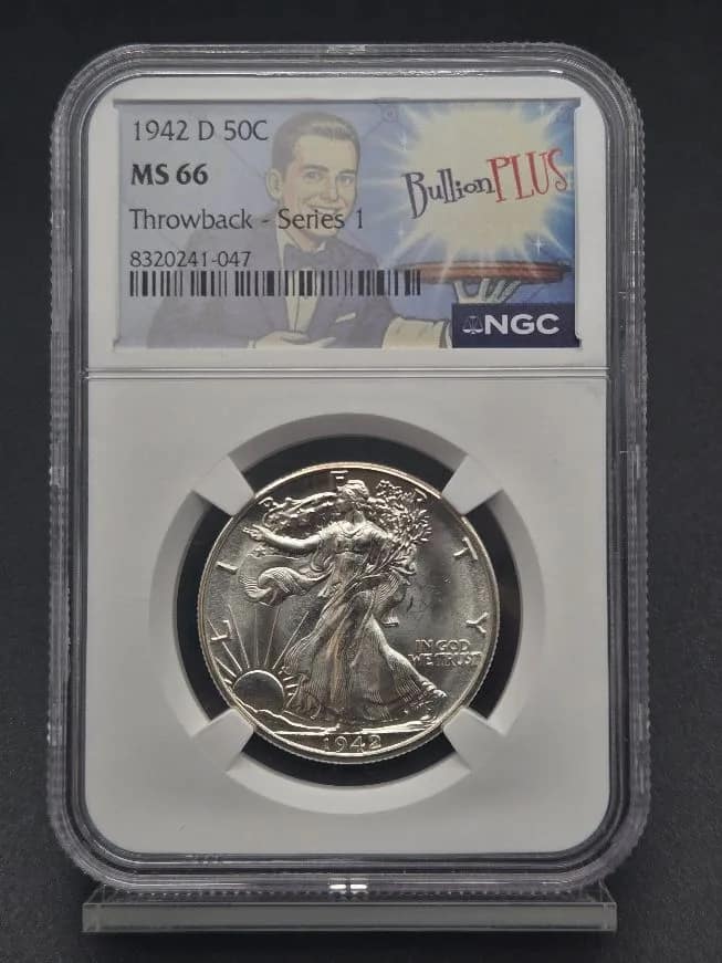 + Free ShippingOffered here is a stunning 1942-D Walking Liberty Half Dollar, certified MS66 by NGC, featuring the eye-catching BullionPlus Throwback Series 1 label. Struck at the Denver Mint during the height of World War II, this classic silver half dollar represents one of the most beloved designs in American coinage.