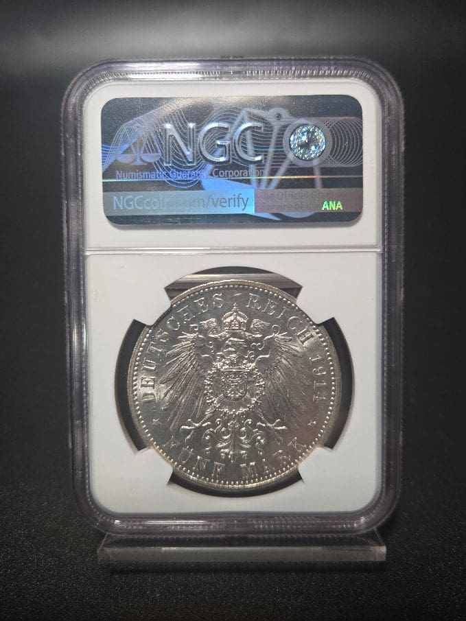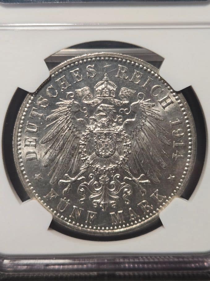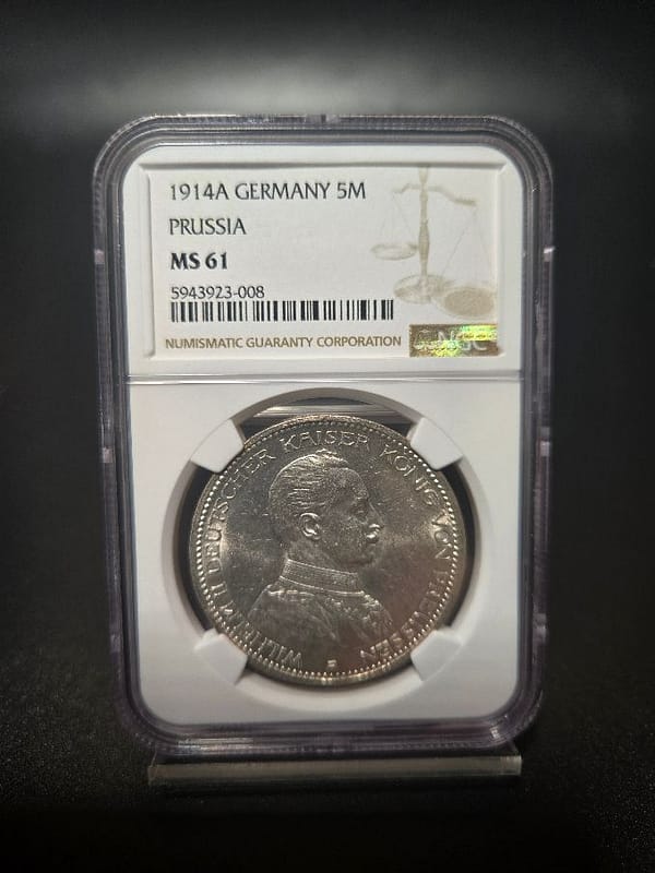The 1914A Germany 5 Mark Prussia coin graded NGC MS 61 is a collectible silver coin featuring King Wilhelm II of Prussia, issued shortly before the outbreak of World War I.