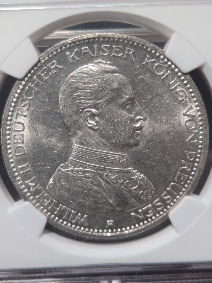+ Free ShippingThe 1914A Germany 5 Mark Prussia coin graded NGC MS 61 is a collectible silver coin featuring King Wilhelm II of Prussia, issued shortly before the outbreak of World War I.